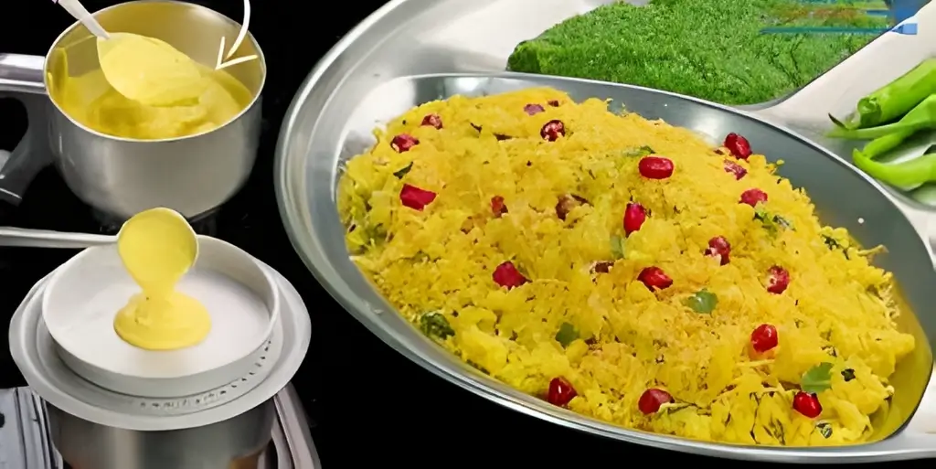 Sev Khamani is a popular breakfast and evening snack in Surat. It’s made from crumbled chana dal, mixed with spices, and garnished with sev and pomegranate.